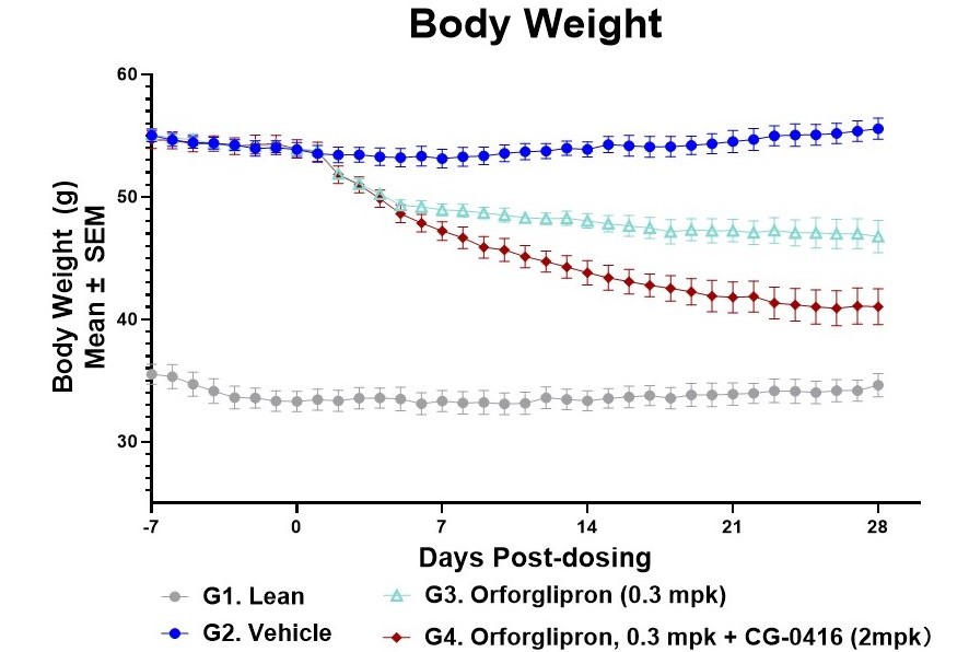 The studies further explored combination therapies of CG-0416 with various GLP-1 RAs, including semaglutide and oral orforglipron, revealing powerful "1+1>2" synergistic effects.